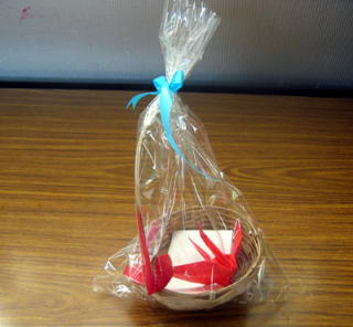 手作りのかごの中に、おりづると手紙を入れてラッピングしました