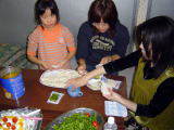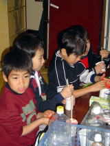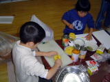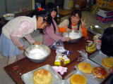ケーキを何個もつくります。男の子も結構楽しそう。スポンジは炊飯器で作りました(ちょっとかため)。 |