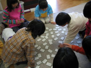 並行して,遊び室では,「親子百人一首大会」も開かれました。予想に反し(?)「昔操った杵柄」チームが実力を発揮し,高学年チームを相手に2勝を上げました。