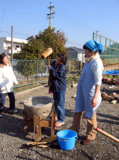 | 暮れの恒例行事といえばおもちつきであります(今回はきみまろ風で)。 都会ではおもちつきもすっかり珍しくなってしまいましたが、どろんこの皆さんは慣れたものでございます。一頃に比べますとつく量も減ったそうですが、元気な声が学童に響き渡ったのでございます。 |