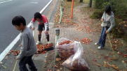 学童の前や歩道をみんなで掃除しました。桜の木の葉がたくさん落ちていて、掃いても掃いても積もります。でもみんな熱心にお掃除してくれました。道行く車の人たちも、温かい目で通り過ぎていきます。 外だけでなく、窓拭きなんかも自分たちでしますよ! |