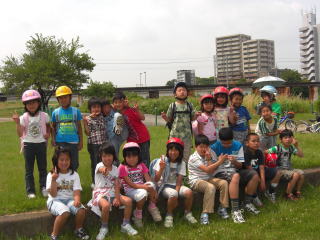 | 5月31日(月)、予定通りサイクリングに出かけました。今年度はまだ路上テストに合格していない仲間もいるということで、出発前に「いつも以上に安全に気をつけて行くこと、そのためには前の子が遅くても「はやく!」とか絶対に言わないことなどを話をしました。またサイクリングロードに行くまでは自転車をおして行くと伝えたところ「ええ!」とブーイングの声もでましたが、「みんなで安全に楽しく行くためだからね!」と言うと何とか納得してくれて、出発をしました。 初めてのサイクリングということで、自転車をおして下り坂を下るのは一年生にとってはとても難しく、フラフラしながら必死でおしていくという感じでしたが、何とか河川敷の入り口まで到着。その後自転車をこぎ始めました。 <中略> 1時間30分ほどかかって木が崎公園に無事到着することができました。 途中ナゴヤドームが見えたり、瀬戸電が走るのを見て「あ!電車だ!!」と大喜びするなど、普段見ることのできない景色を見ることができたのも良かったのではないかと思います。 |